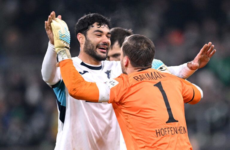 BREMEN, GERMANY - JANUARY 27: Ozan Kabak and Oliver Baumann of TSG 1899 Hoffenheim celebrate victory at the end of the Bundesliga match between SV Werder Bremen and TSG Hoffenheim at Weserstadion on January 27, 2026 in Bremen, Germany. (Photo by Stuart Franklin/Getty Images)
